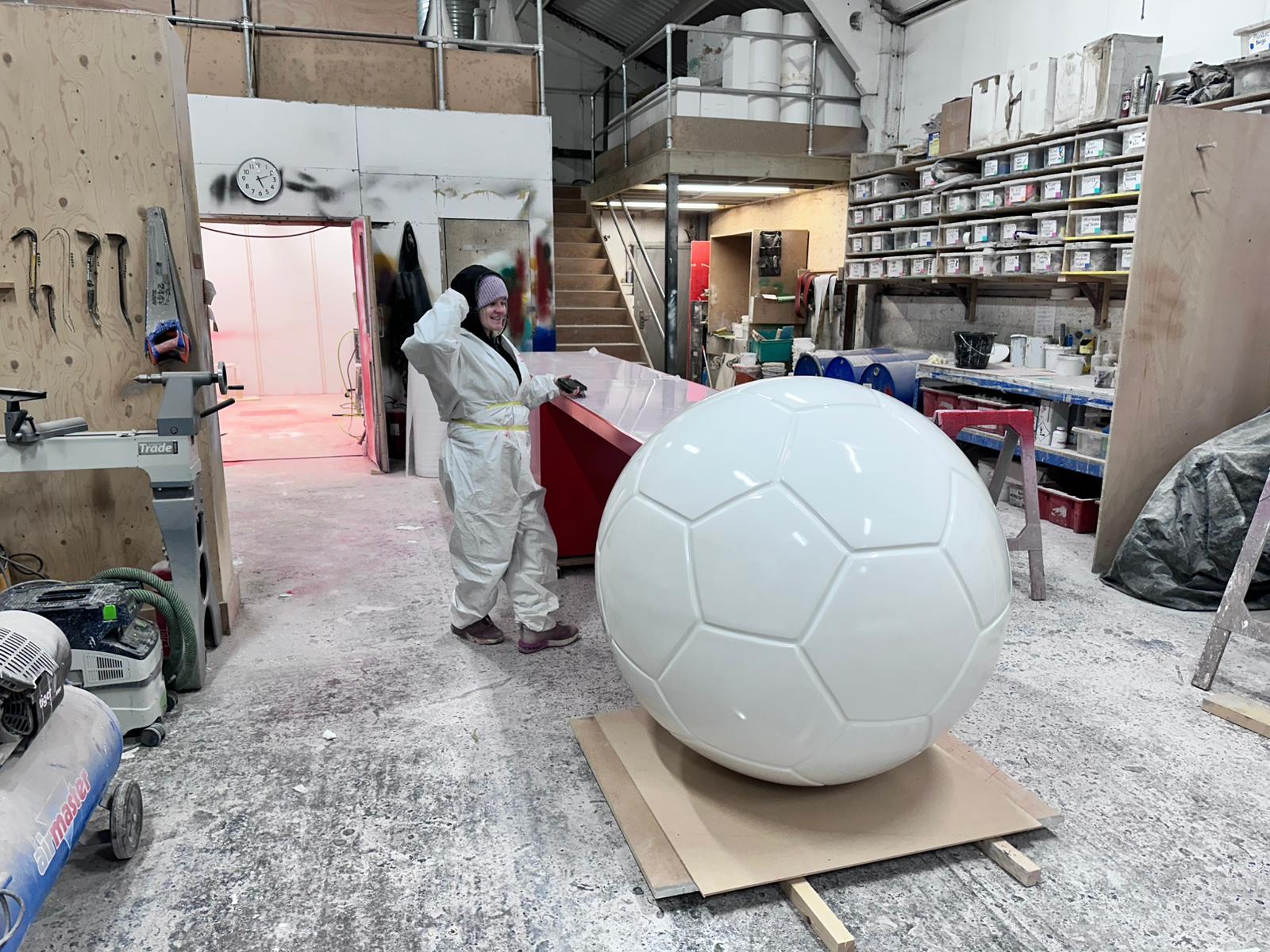 The ball was finished in a glossy white, and finished with vinyl graphics . The desk was installed in the flagship Adidas store on Oxford Street. The ball and desk with Perspex graphic top looked great in its final position in the shop with the lights reflecting against the glossy finish.