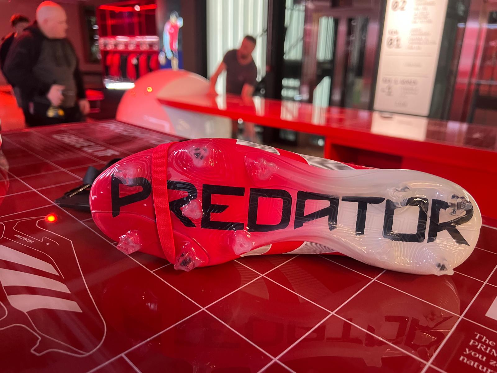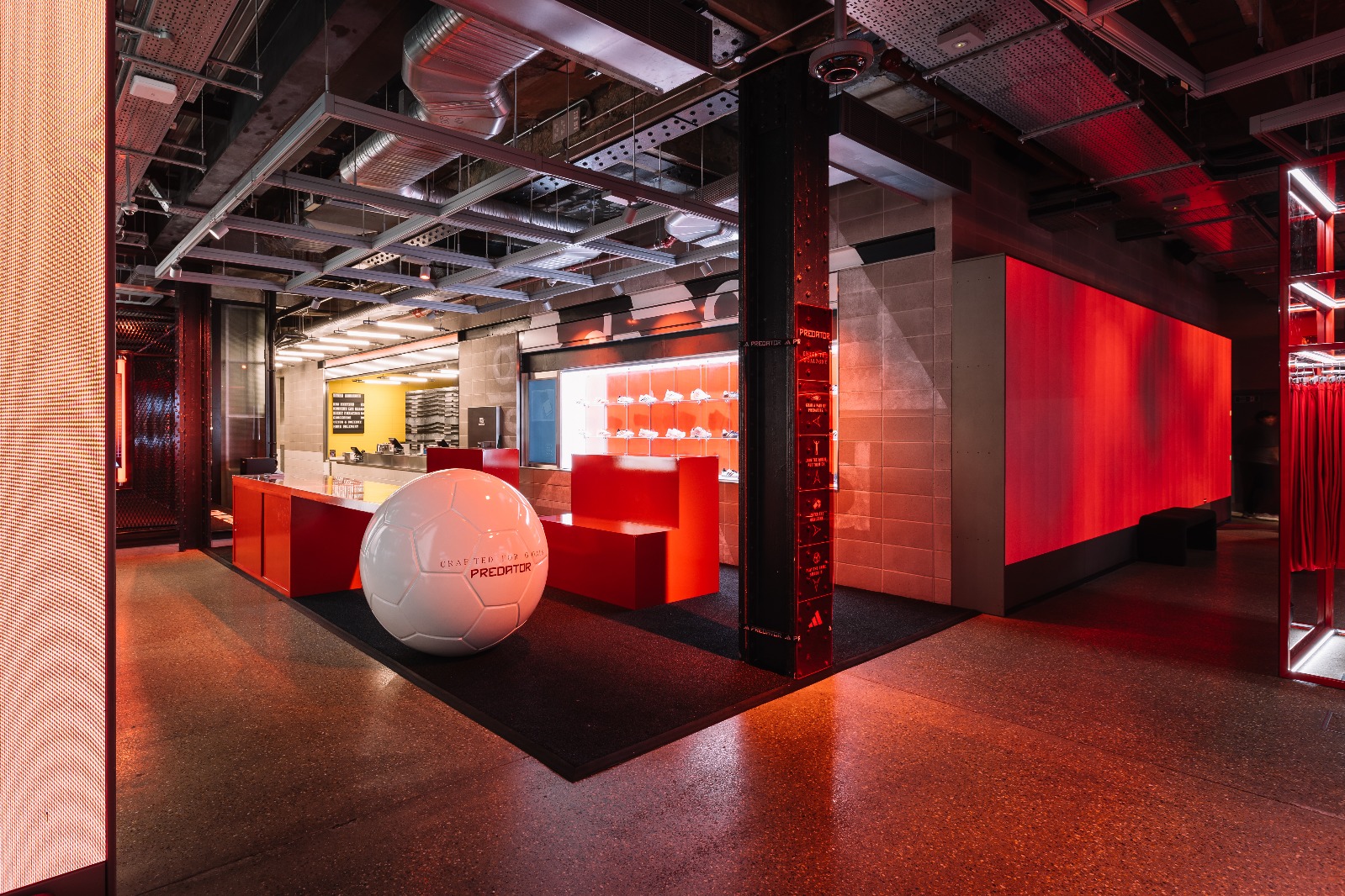 It’s hard to miss our giant football and desk when you walk into the flagship adidas store on Oxford Street to buy your Predator football boots, the glossy white ball and red desk stand out nicely with interesting graphics to catch your eye and a striking red cabinet for the staff to keep the shoes secure.